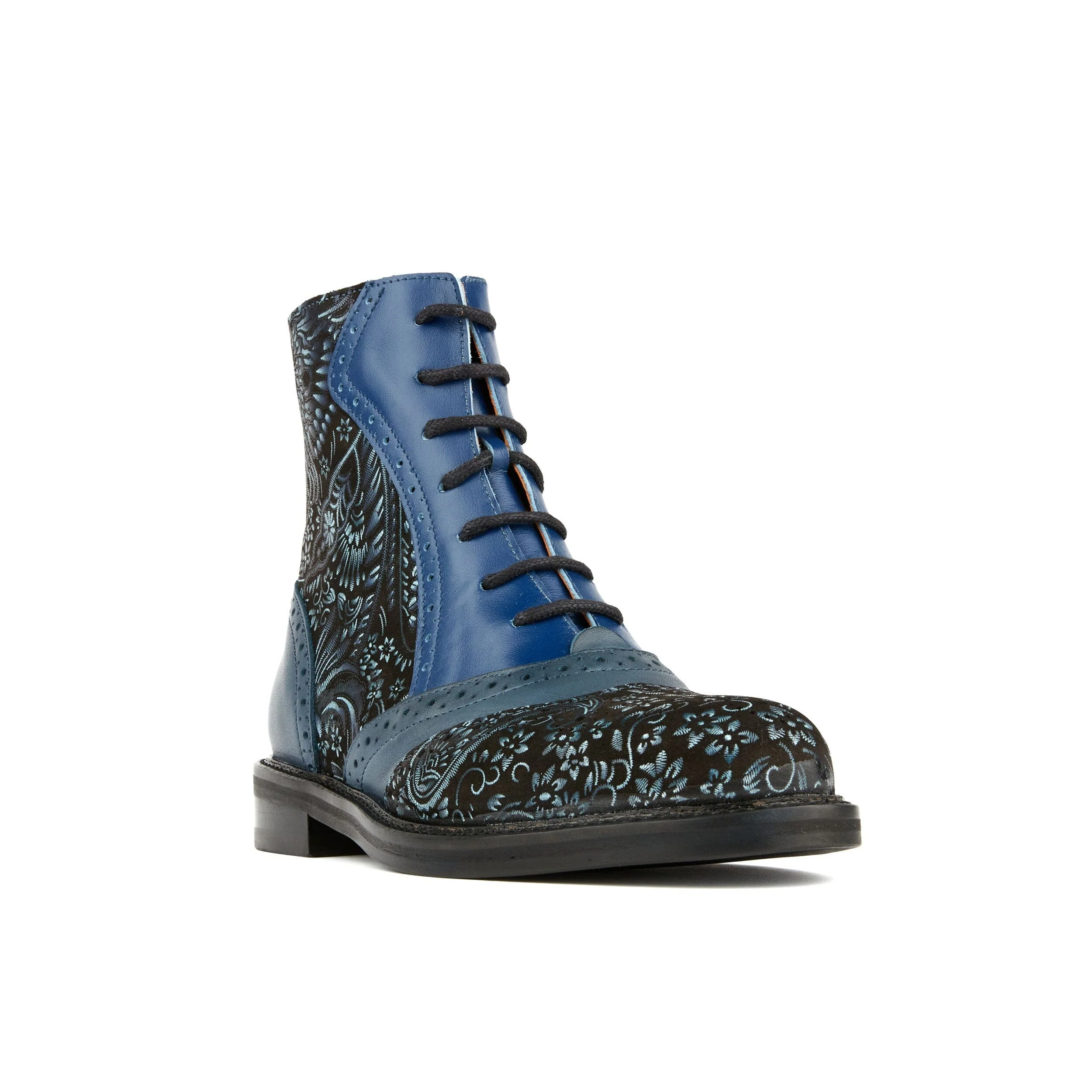 Forever classic, our Brick Lane brogue-style women’s ankle boots have all the traditional features, punched holes, winged tips, and for an added extra contrast, leather, for a flash of extra style between the brogue perforations. Fully leather lined for maximum comfort, and handcrafted in beautiful Italian leather, these women’s ankle boots are available in a range of fun colors, including deep cobalt blue leather with a paisley nubuck insert. Brick Lane boots have a side zipper and a lightweight rubber sole.