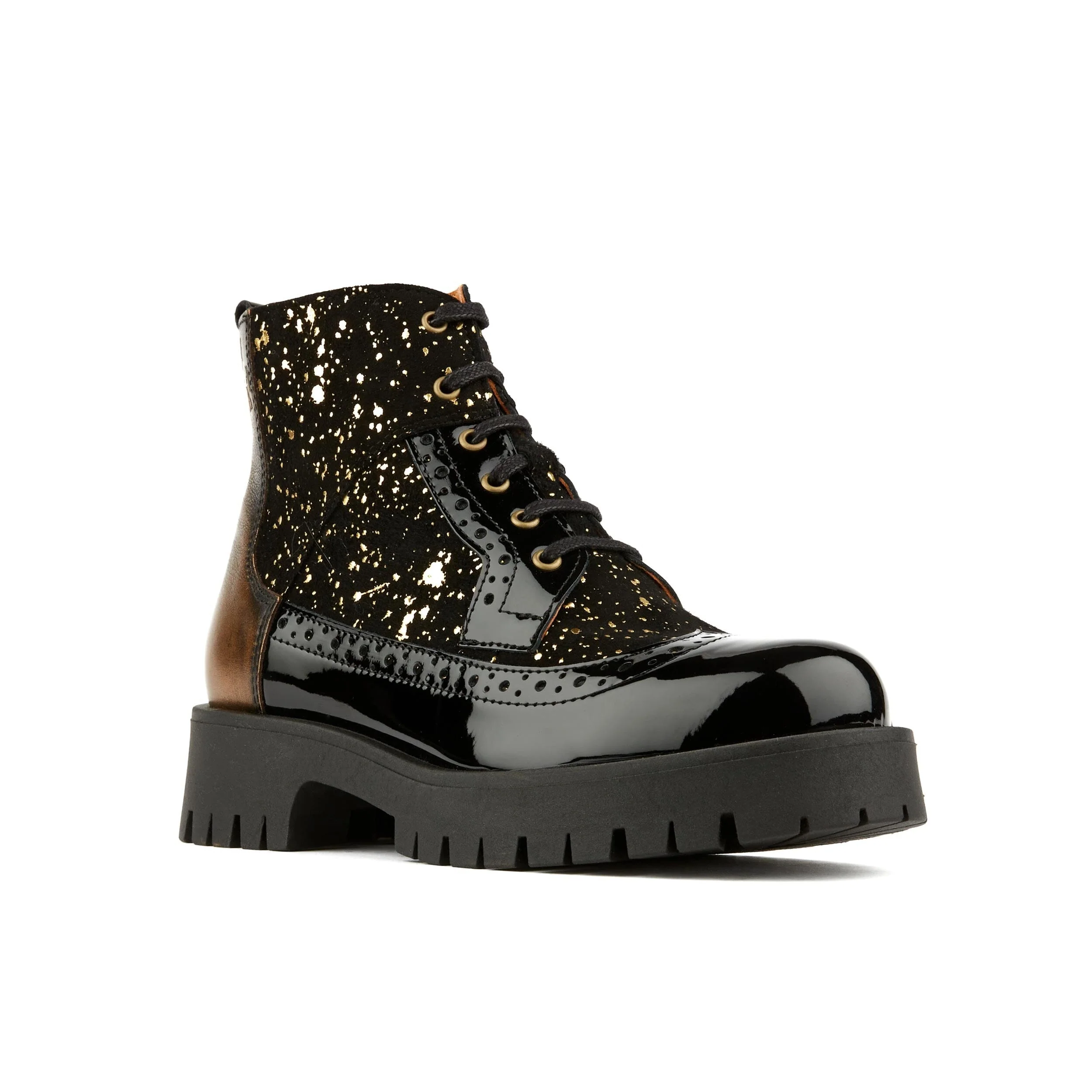 The Hatter Platform Black Gold is a trendy, platform lug sole women’s ankle boot with a side zipper for easy access. This womens platform boot is an effortless, chic women’s designer ankle boot with a mix of black patent leather, gold umbrae leather and textured gold suede textile making this women’s ankle boot a knockout. Let this Italian leather women’s platform shoe comfort your feet. The lug platform makes walking in the Hatter Platform Black & Gold a breeze.