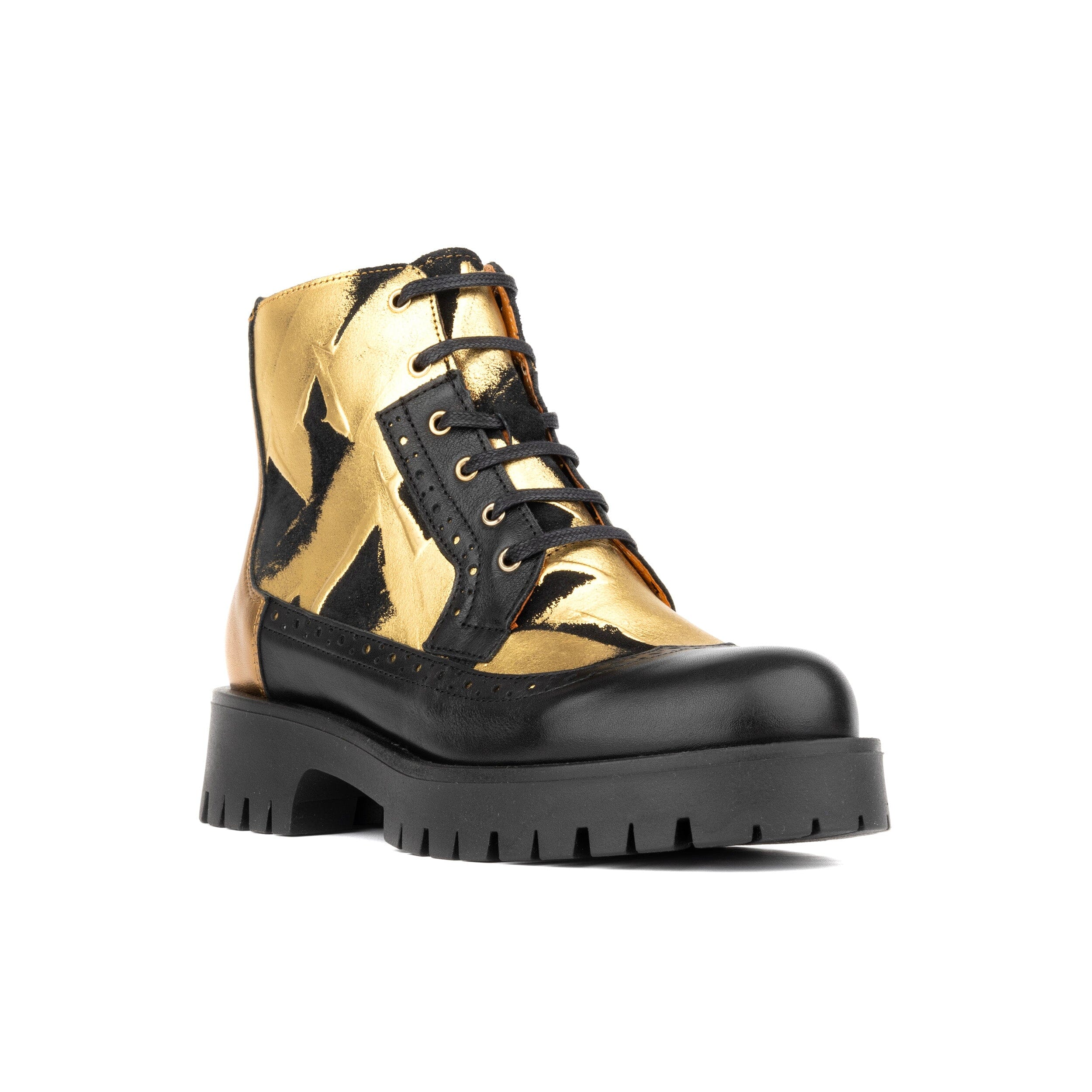 The Hatter Platform Gold & Black is a trendy, platform lug sole women’s ankle boot with a side zipper for easy access. This womens platform boot is an effortless, chic women’s designer ankle boot with a mix of black patent leather, gold textured leather and black leather making this women’s ankle boot a knockout. Let this Italian leather women’s platform shoe comfort your feet. The lug platform makes walking in the Hatter Platform Gold & Black a breeze.
