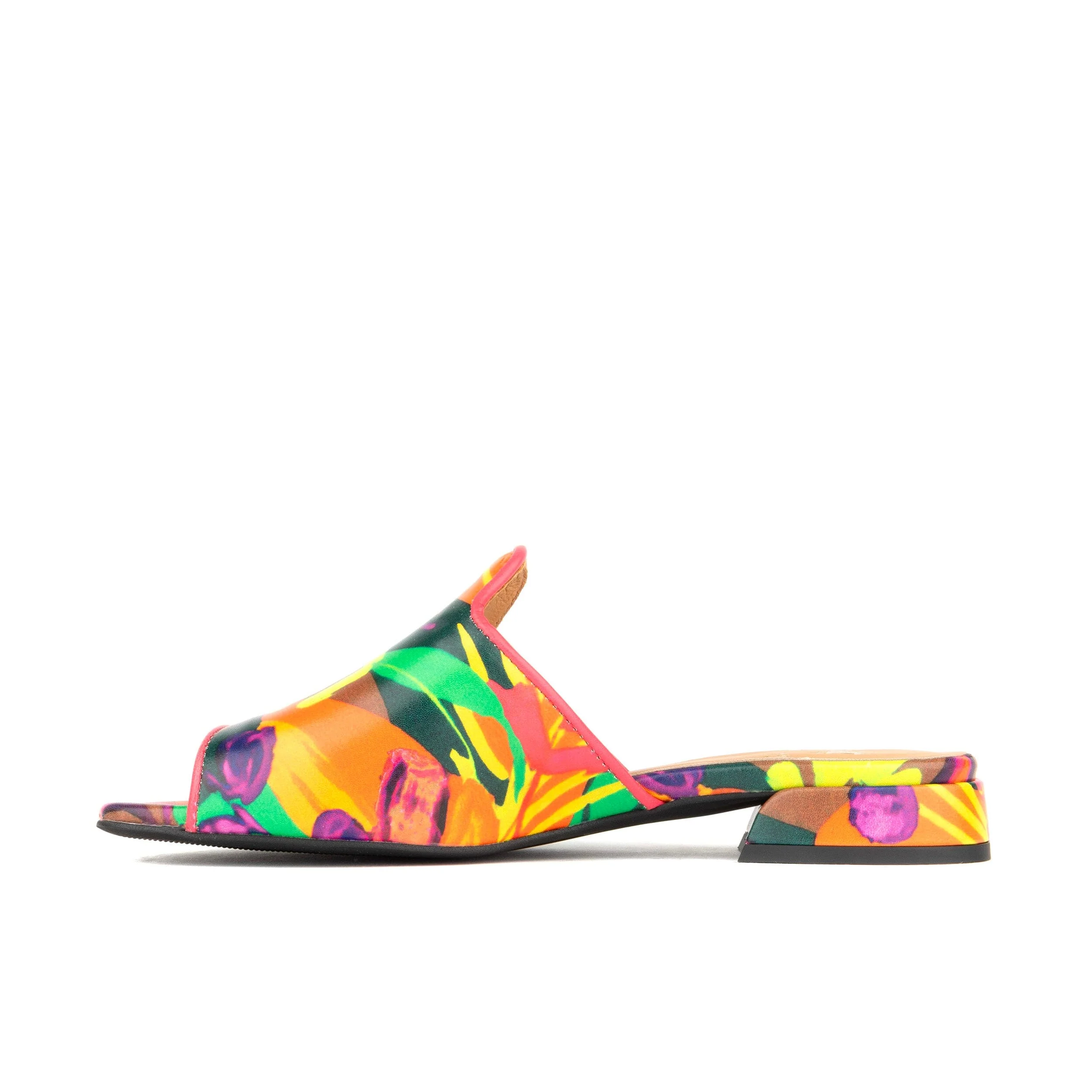 The South Beach women’s leather sandal is a mule-style sandal designed as an easy slip-on that is fully leather lined and incorporates a padded footbed. The South Beach mule is perfect for running errands or relaxing at the park. The South Beach is your go to women's designer sandal. This Italian leather sandal really pops with a bright multi colored pattern and 3/4" heel.